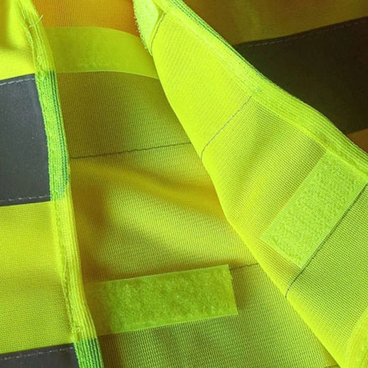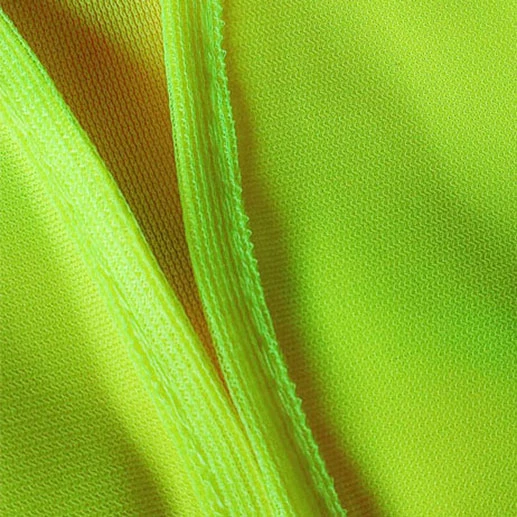 Tela 100% poliéster fluorescente, altamente visible con luz diurna. Ribete del color del chaleco.